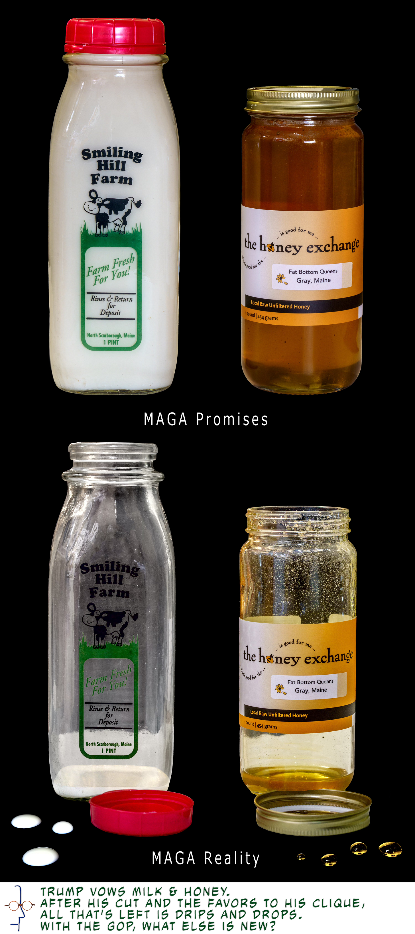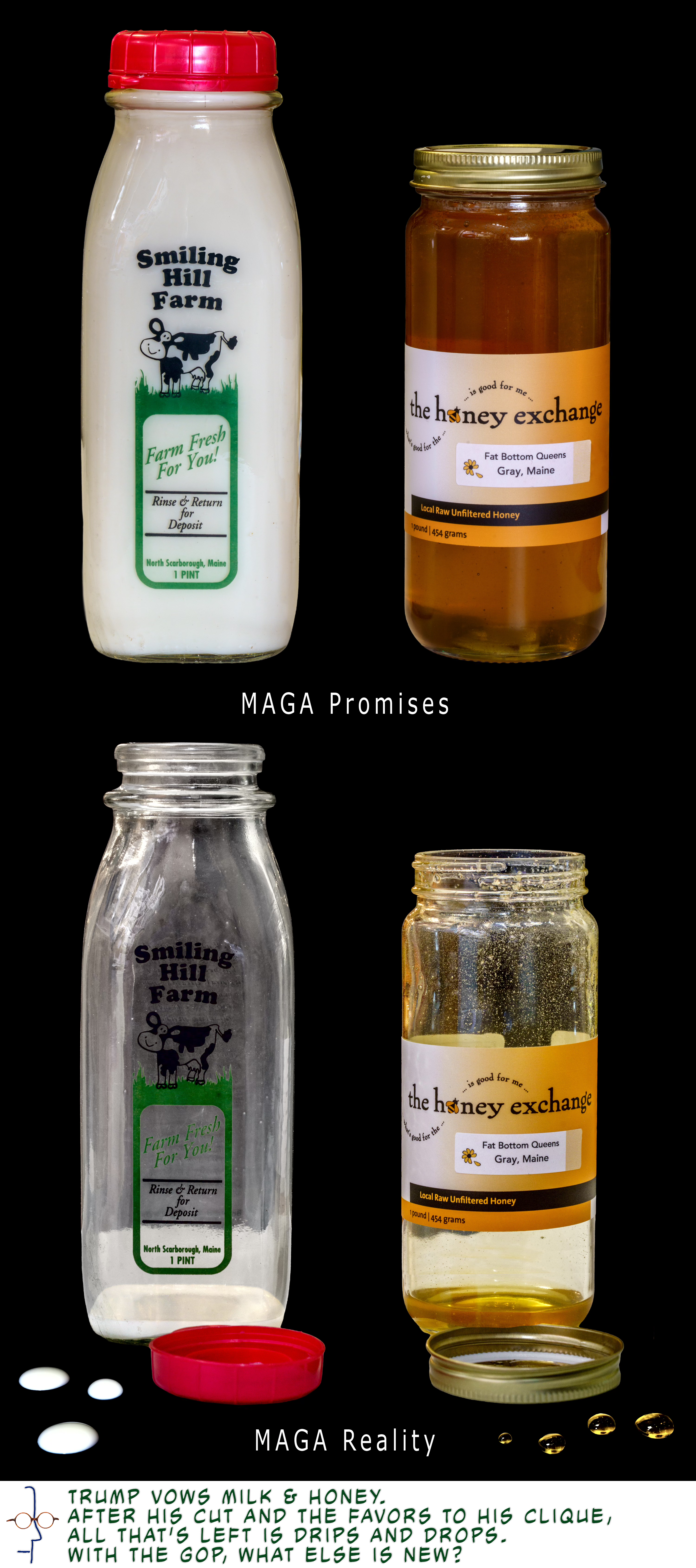 Smiling Hill Farm and Honey Exchange deserve some great national exposure. As a neighborhood staple these prominent high quality Made In Maine trademarks are ones that deliver on their promises with every container. While my instant reaction was anger that these were chosen to make a satirical point, reducing their stature by association with the Golden Crybaby Pedophile Protector in Chief and convicted felon, I relented. Thank you for choosing these images of the best of Maine, the representative of a quality standard of American integrity, the image of independent entrepreneur stability in US economy, and a demonstration of community support. This is what Democracy and capitalism looks like. And the threat to the core of American strength looks like the sour milk and mold tainted honey that is left for the huddled masses. The challenge is to maintain the Smiling Hill and Honey Exchange promise in spite of the Little Bird Flippin Chief.